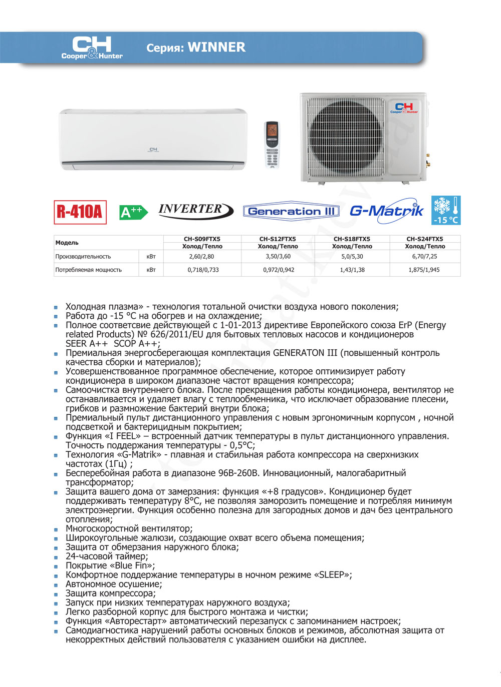 Кондиционеры Cooper&Hunter серии Winner Inverter
